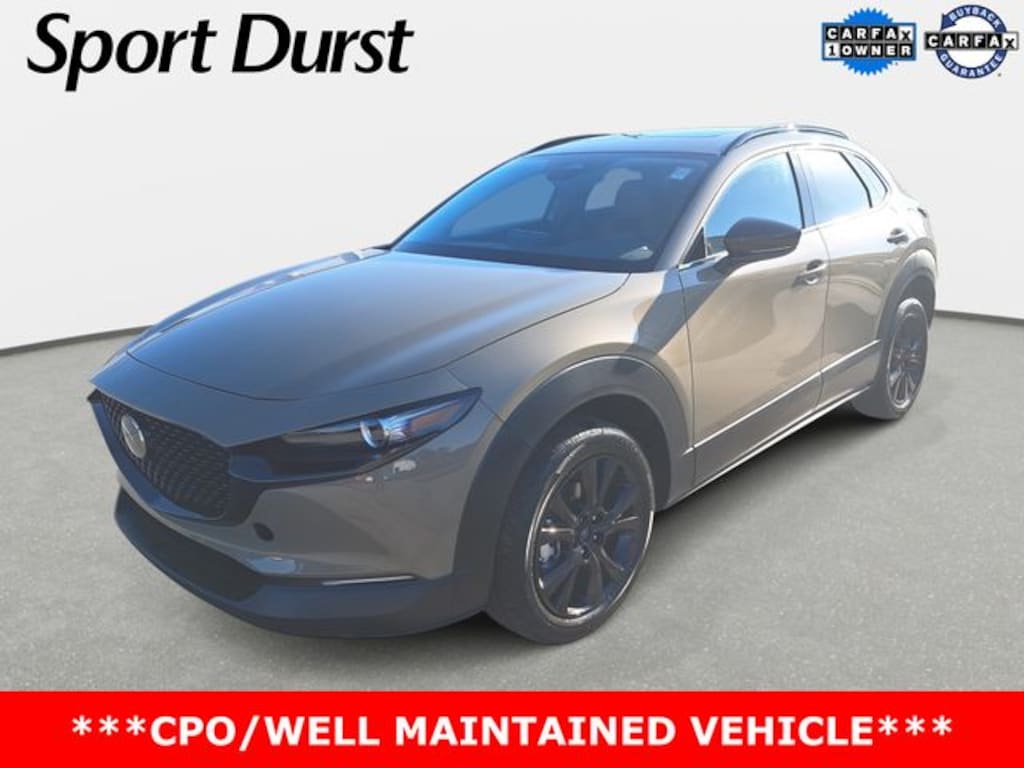 Come See This 2025 Zircon Sand Metallic Mazda CX-30 2.5 Carbon Turbo AWD and many more at Sport Durst Automotive today!